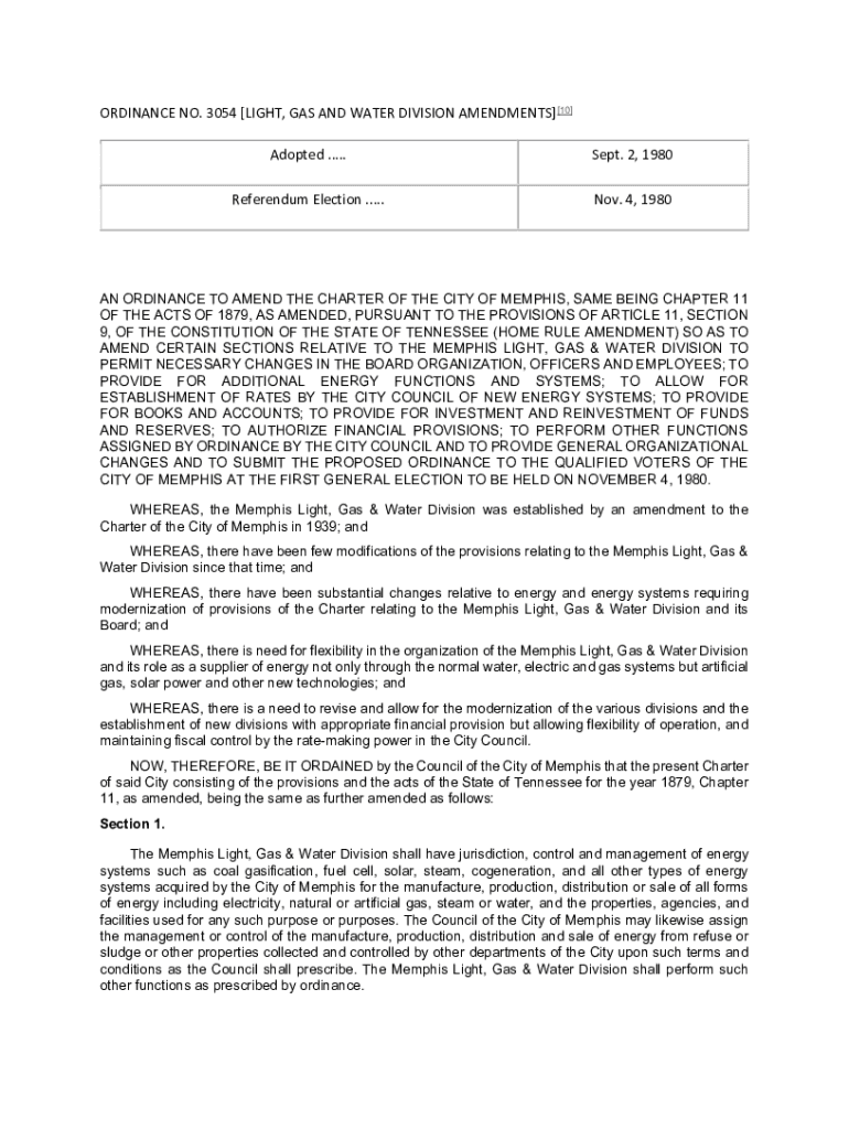 ORDINANCE NO. 3054 [LIGHT, GAS AND WATER DIVISION AMENDMENTS] [10] Adopted ..... Sept. 2, 1980Referendum Election ..... Nov. 4, 1980AN ORDINANCE TO AMEND THE CHARTER OF THE CITY OF MEMPHIS, SAME BEING