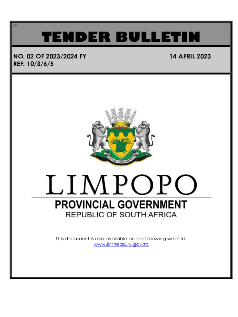 ;/`TENDER BULLETIN NO. 02 OF 2023/2024 FY REF: 10/3/6/514 APRIL 2023This document is also available on the following website: www.limtreasury.gov.zaLIMPOPO PROVINCIAL TENDER BULLETIN NO 02 of 2023/24