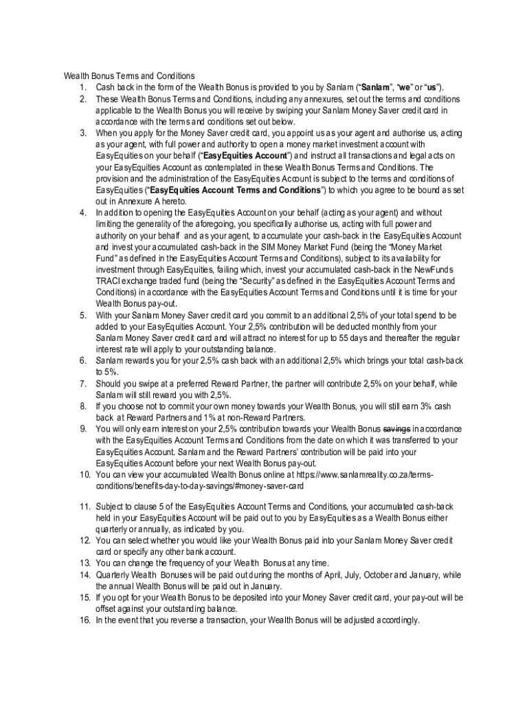 Wealth Bonus Terms and Conditions 1. Cash back in the form of the Wealth Bonus is provided to you by San lam (San lam, we or us). 2. These Wealth Bonus Terms and Conditions, including any appendixes,