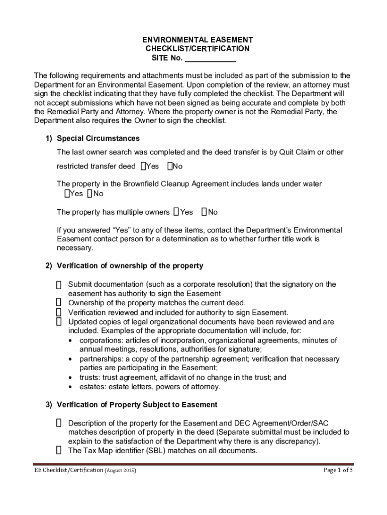 ENVIRONMENTAL EASEMENT CHECKLIST/CERTIFICATION SITE No. ___ The following requirements and attachments must be included as part of the submission to the Department for an Environmental Easement. Upon