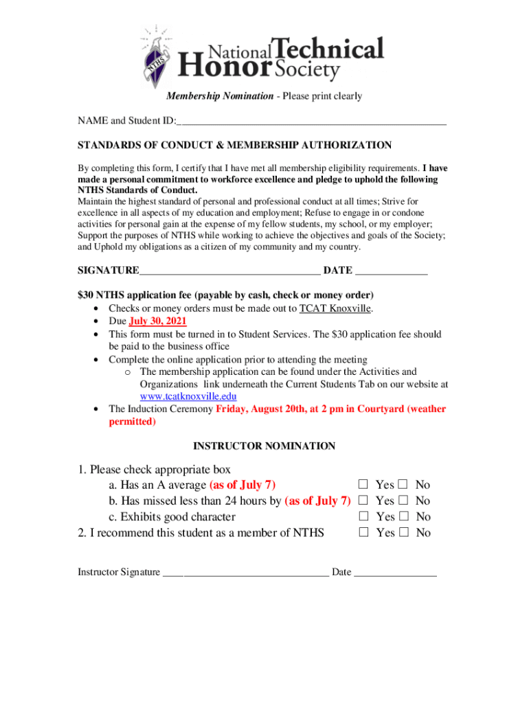 Membership Nomination Please print clearly NAME and Student ID:___ STANDARDS OF CONDUCT & MEMBERSHIP AUTHORIZATION By completing this form, I certify that I have met all membership eligibility requirements.