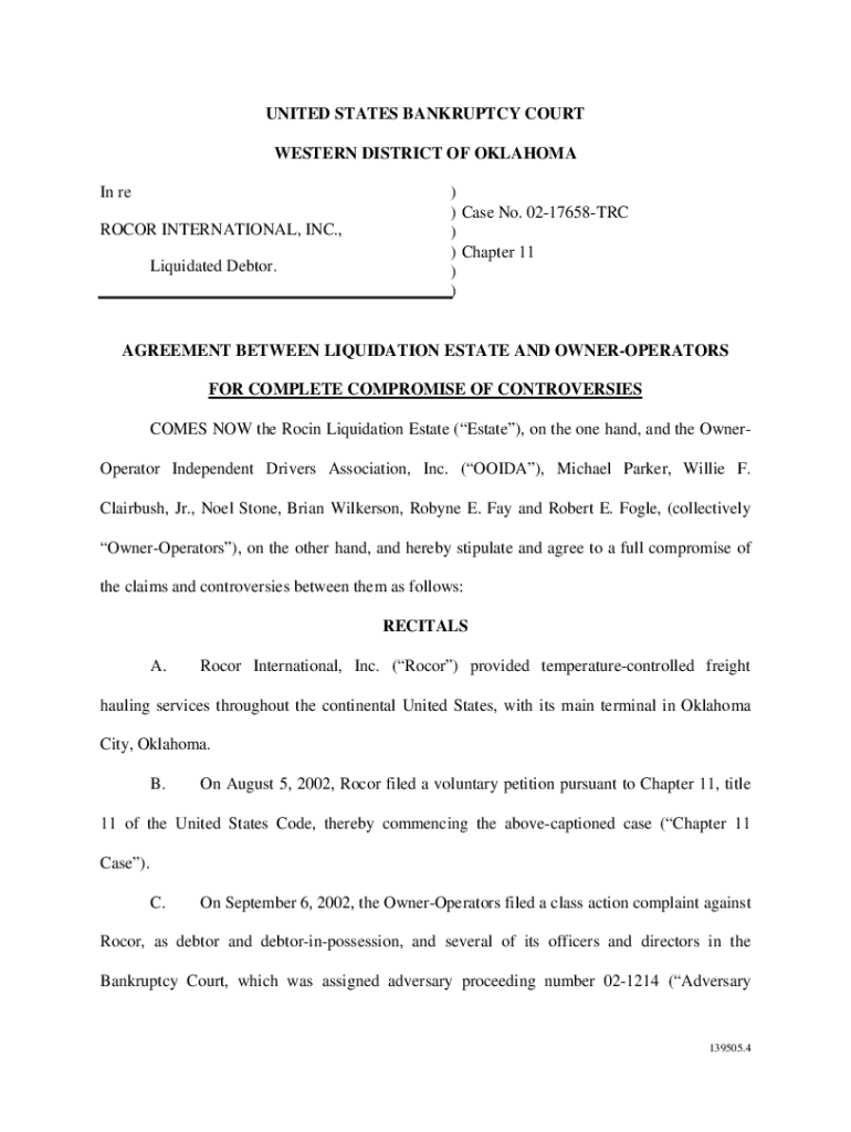 UNITED STATES BANKRUPTCY COURT WESTERN DISTRICT OF OKLAHOMA In re ROTOR INTERNATIONAL, INC., Liquidated Debtor.) ) Case No. 0217658TRC)) Chapter 11))AGREEMENT BETWEEN LIQUIDATION ESTATE AND OWNEROPERATORS