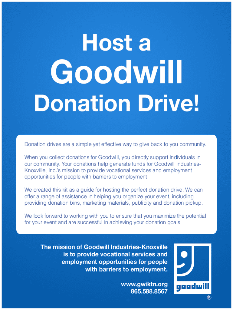 Host aGoodwillDonation Drive! Donation drives are a simple yet effective way to give back to you community. When you collect donations for Goodwill, you directly support individuals in our community.