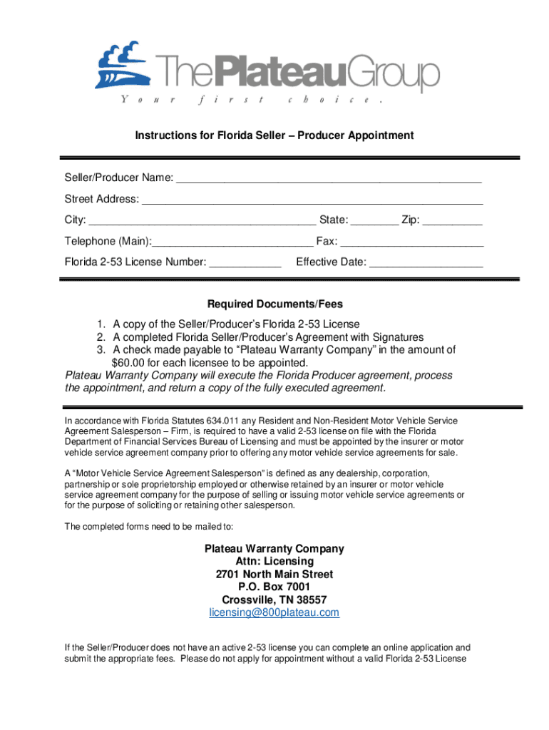 Instructions for Florida Seller Producer AppointmentSeller/Producer Name: ___ Street Address: ___ City: ___ State: ___ Zip: ___ Telephone (Main):___ Fax: ___ Florida 253 License Number: ___Effective