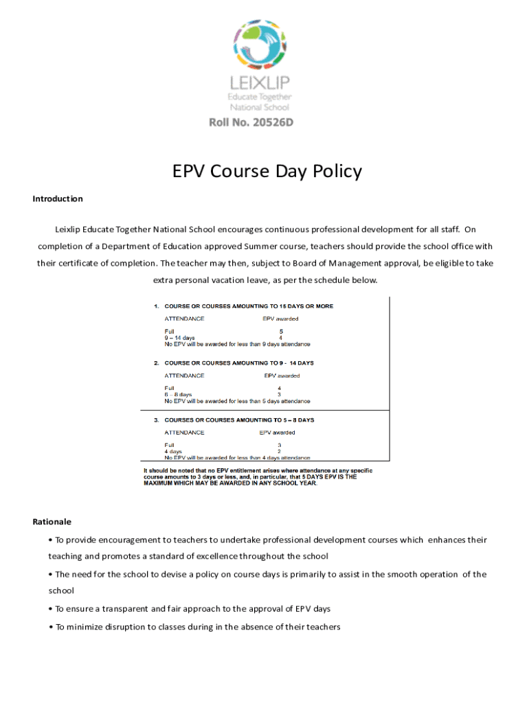 EPV Course Day Policy Introduction Laxly Educate Together National School encourages continuous professional development for all staff. On completion of a Department of Education approved Summer course,