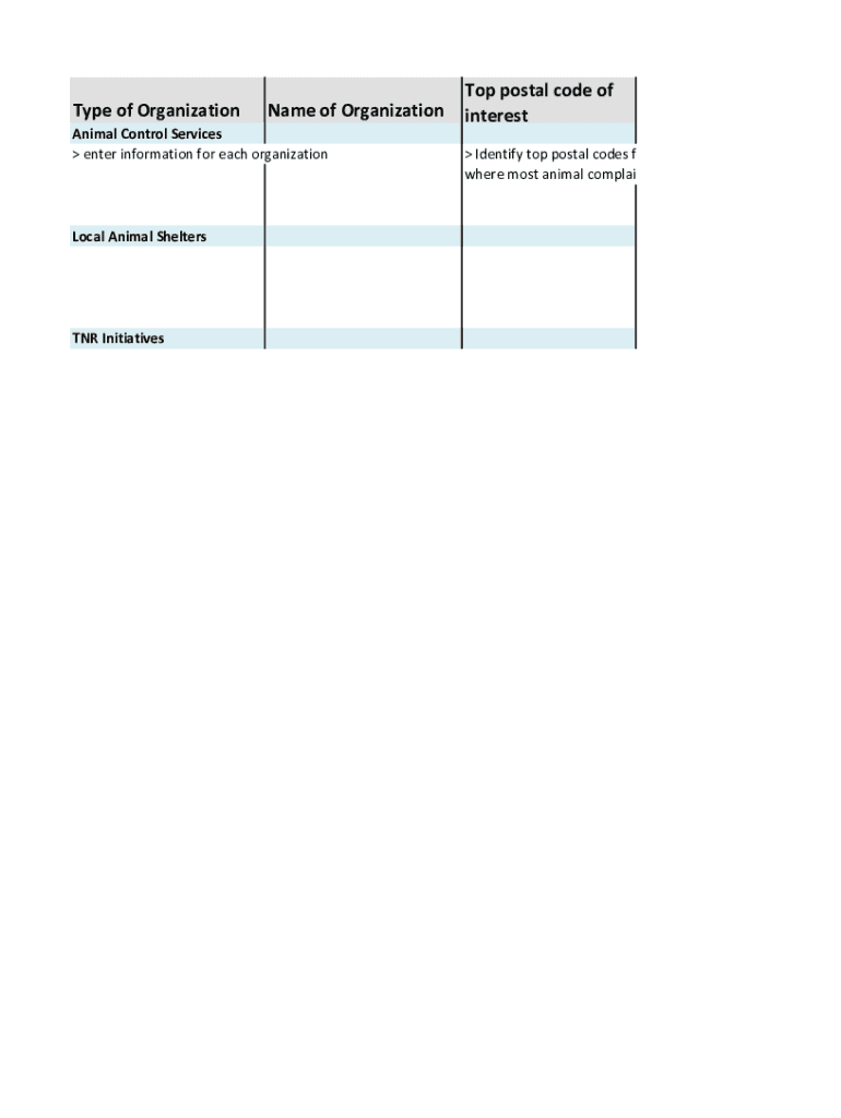 enter information for each organizational Animal Shelters TNR Initiatives postal code of