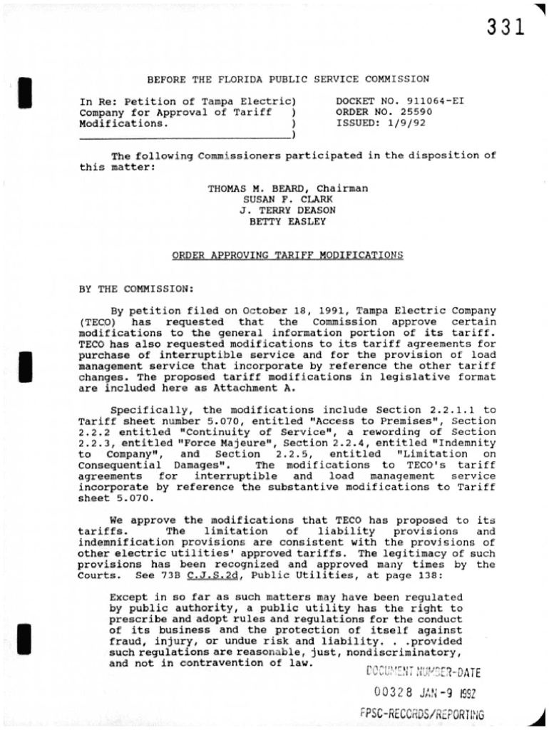 33 1 BEFORE THE FLORIDA PUBLIC SERVICE COMMISSION In Re: Petition of Tampa Electric) Company for Approval of Tariff) Modifications. ))___DOCKET NO. 911064EI ORDER NO. 25590 ISSUED: 1/9/92The following