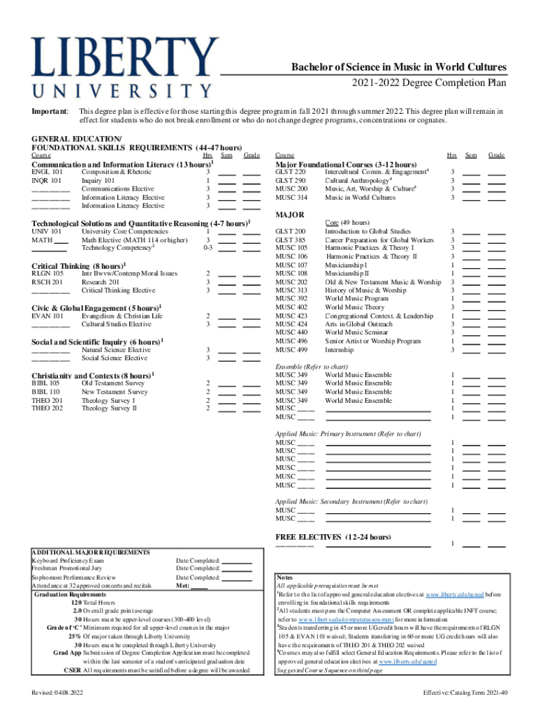 Bachelor of Science in Music in World Cultures 20212022 Degree Completion Plan Important:This degree plan is effective for those starting this degree program in fall 20 21 through summer 2022. This