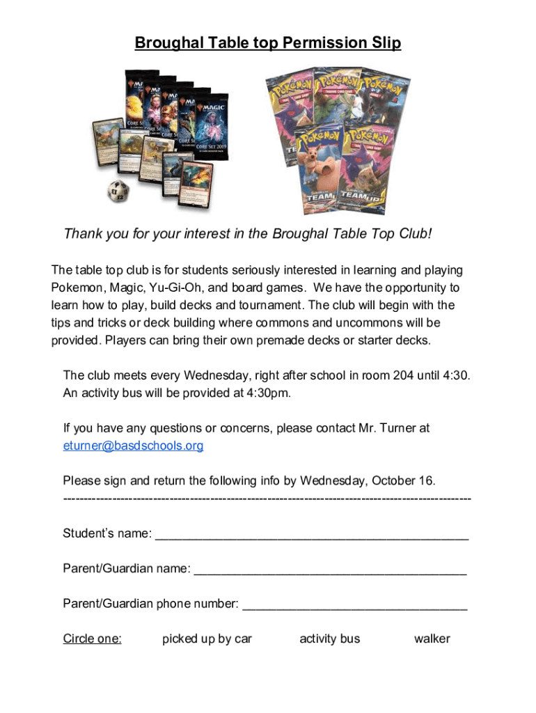 Brougham Table top Permission SlipThank you for your interest in the Brougham Table Top Club! The table-top club is for students seriously interested in learning and playing Pokémon, Magic, Yugo,