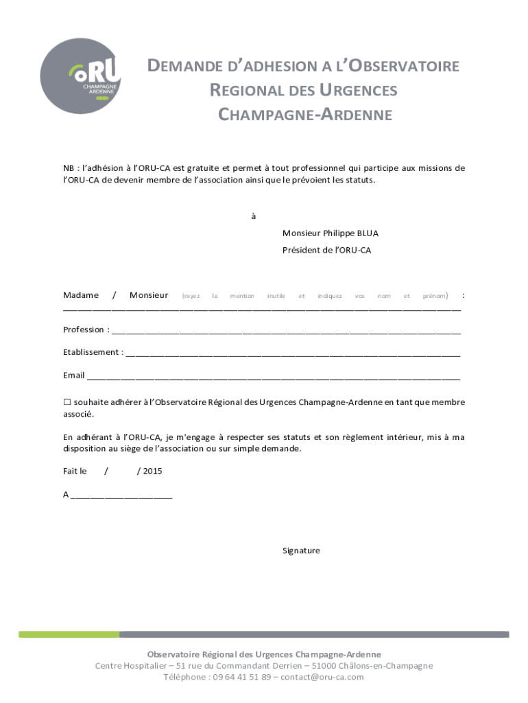 DEMANDED ADHESION A CONSERVATOIRE REGIONAL DES URGENCIES CHAMPAGNEARDENNE NB : adhesion Yoruba est gratuity ET permit tout professional quit participle aux missions de Yoruba de evener member DE association