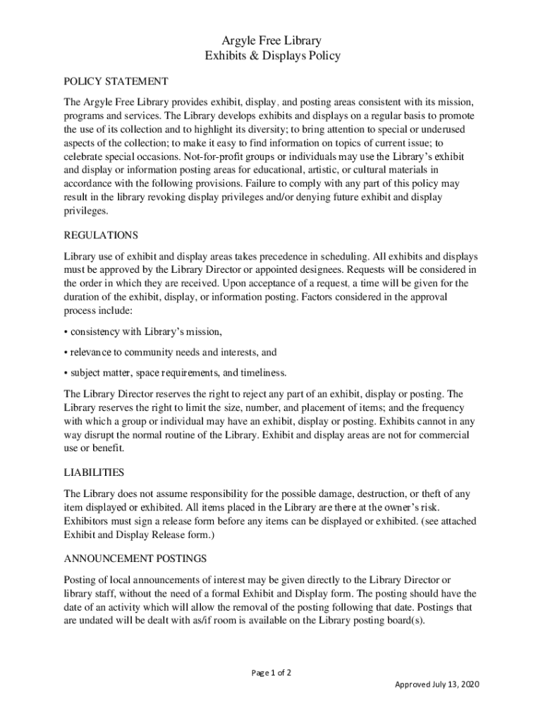 Get the Argyle Free Library Exhibits & Displays Policy - argylelibrary sals