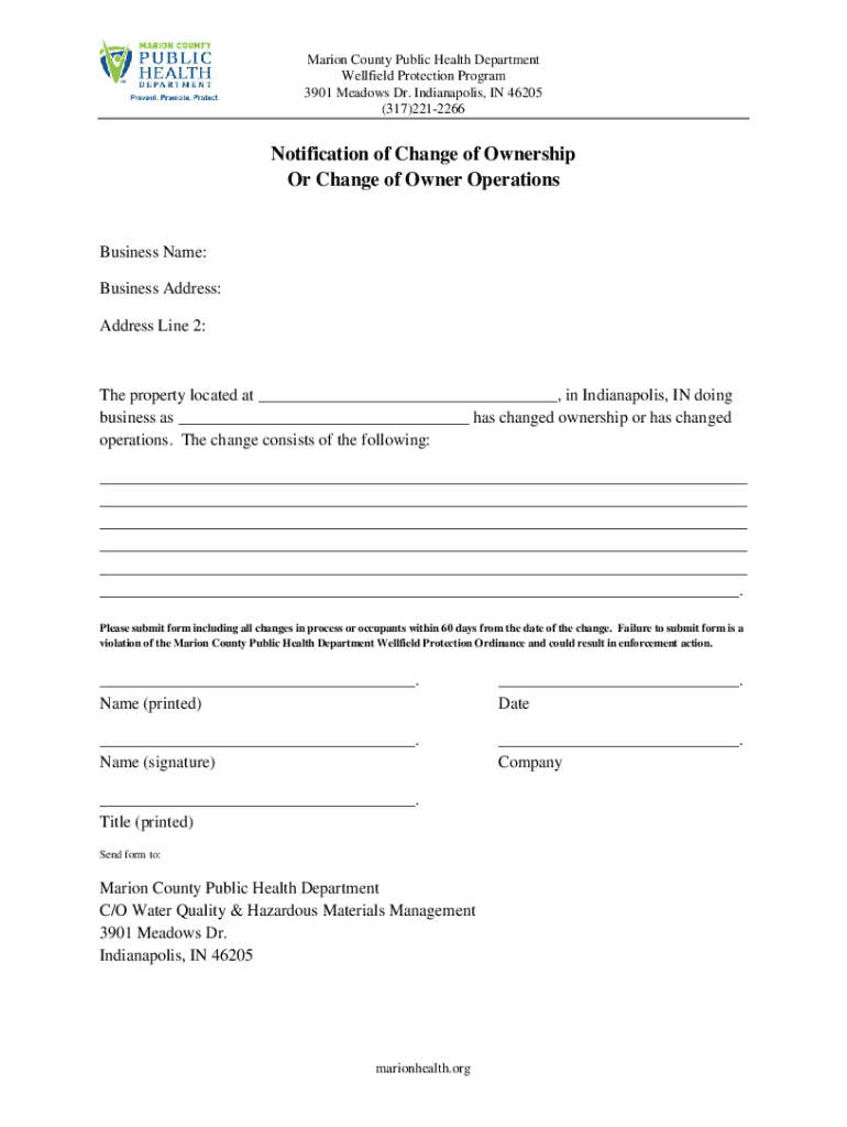 Marion County Public Health Department Well field Protection Program 3901 Meadows Dr. Indianapolis, IN 46205 (317)2212266Notification of Change of Ownership Or Change of Owner OperationsBusiness Name: