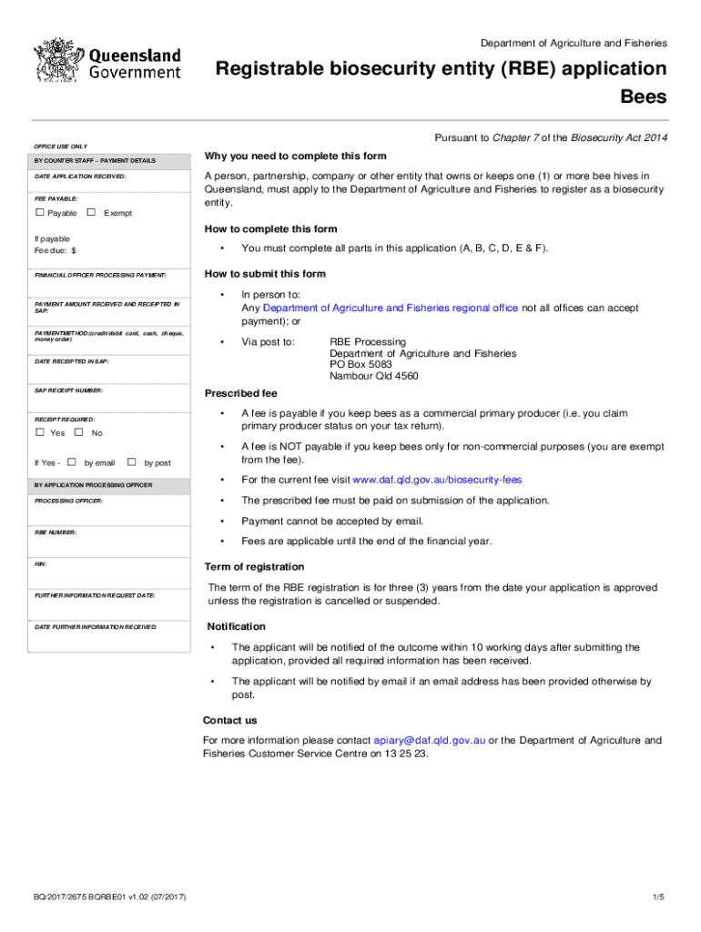 Department of Agriculture and FisheriesRegistrable biosecurity entity (BE) application Bees Pursuant to Chapter 7 of the Biosecurity Act 2014 OFFICE USE ONLY BY COUNTER STAFF PAYMENT DETAILS person,