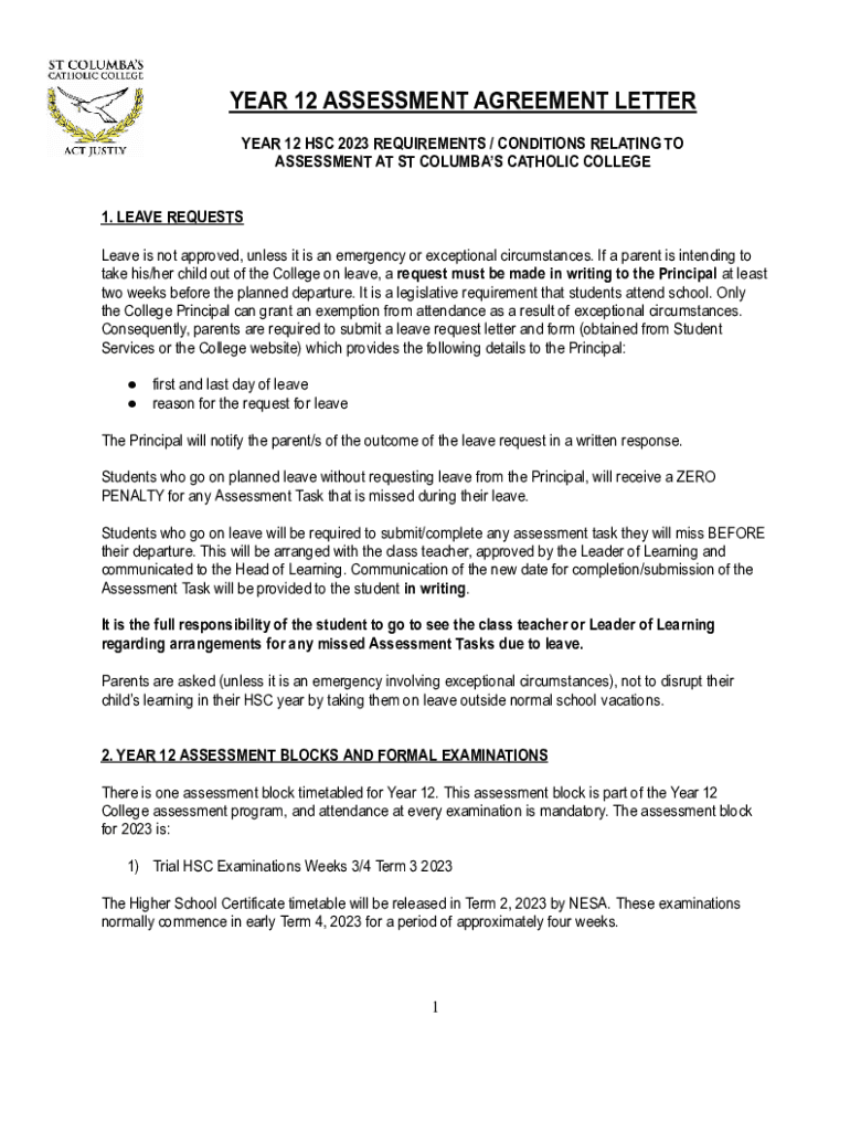 YEAR 12 ASSESSMENT AGREEMENT LETTER YEAR 12 HSC 2023 REQUIREMENTS / CONDITIONS RELATING TO ASSESSMENT AT ST COLUMBUS CATHOLIC COLLEGE 1. LEAVE REQUESTS Leave is not approved, unless it is an emergency