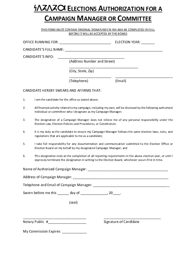 ELECTIONS AUTHORIZATION FOR A CAMPAIGN MANAGER OR COMMITTEE THIS FORM MUST CONTAIN ORIGINAL SIGNATURES IN INK AND BE COMPLETED IN FULL BEFORE IT WILL BE ACCEPTED BY THE BOARDOFFICE RUNNING FOR: ___ELECTION
