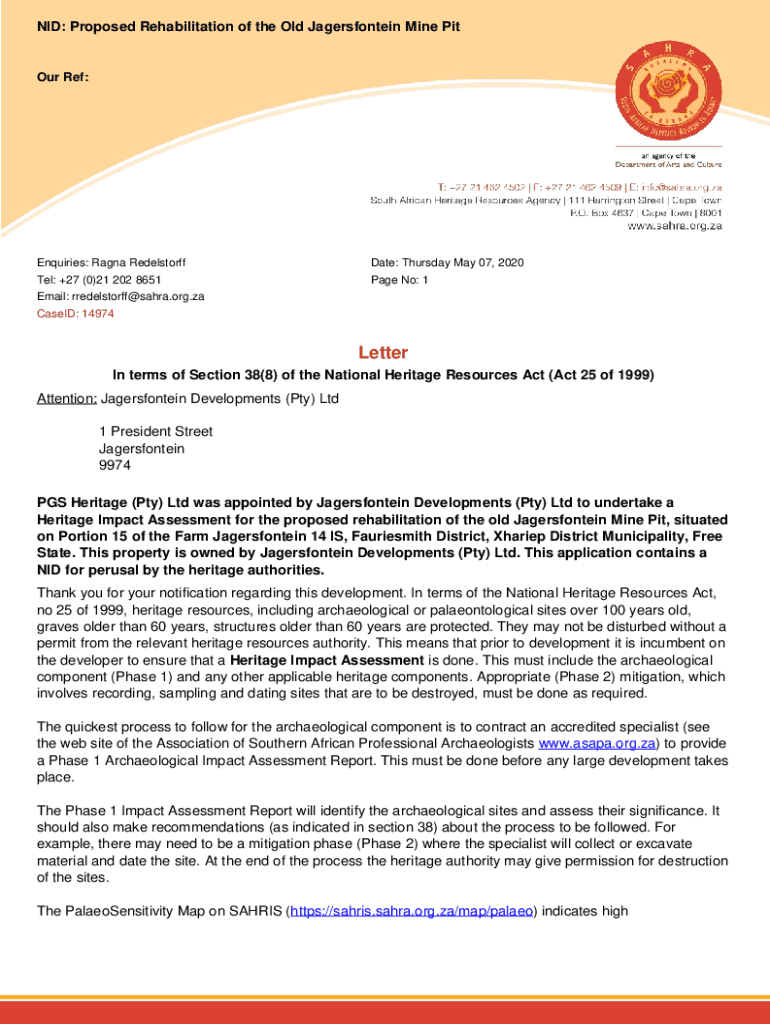 NID: Proposed Rehabilitation of the Old Jagersfontein Mine Tour Ref:Inquiries: Reign RedelstorffDate: Thursday, May 07, 2020Tel: +27 (0)21 202 8651Page No: 1Email: rredelstorff@sahra.org.za
