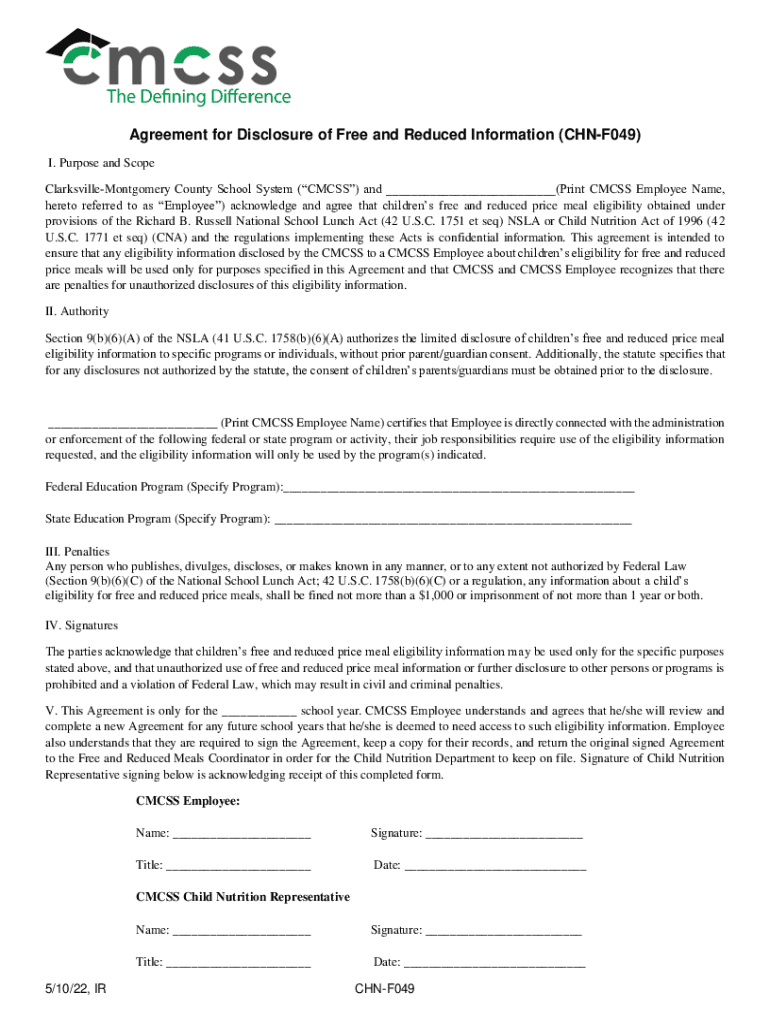 Agreement for Disclosure of Free and Reduced Information (CHNF049) I. Purpose and Scope Clarksville Montgomery County School System (CM CSS) and ___(Print CM CSS Employee Name, hereto referred to