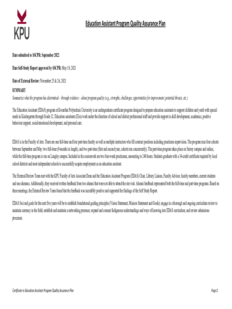 Get the free Education Assistant Program Quality Assurance Plan