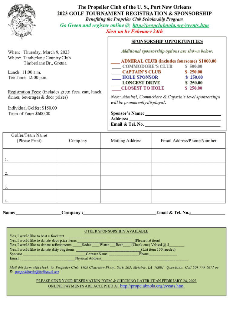 The Propeller Club of the U. S., Port New Orleans 2023 GOLF TOURNAMENT REGISTRATION & SPONSORSHIP Benefiting the Propeller Club Scholarship Program Green and register online @ http://propclubnola.org/events.htm