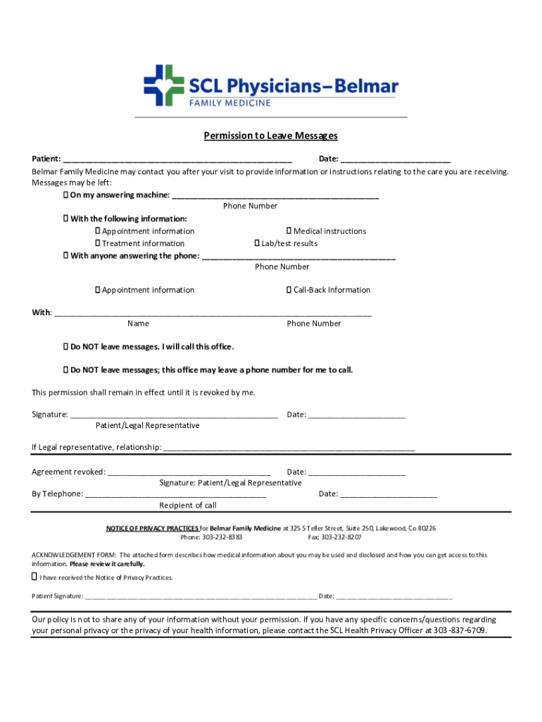 Permission to Leave Messages Patient: ___ Date: ___ Delmar Family Medicine may contact you after your visit to provide information or instructions relating to the care you are receiving. Messages