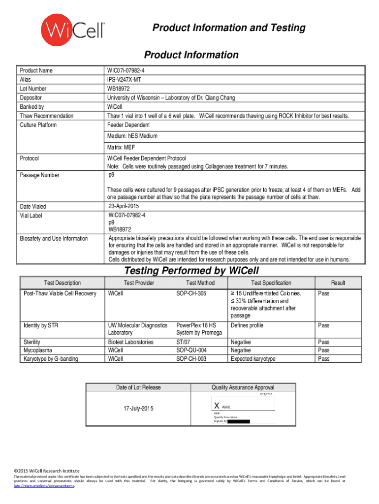 Product Information and Testing Product Information Product Name Alias Lot Number Depositor Banked by Thaw Recommendation Culture PlatformWIC07i079824 iPSV247XMT WB18972 University of Wisconsin Laboratory