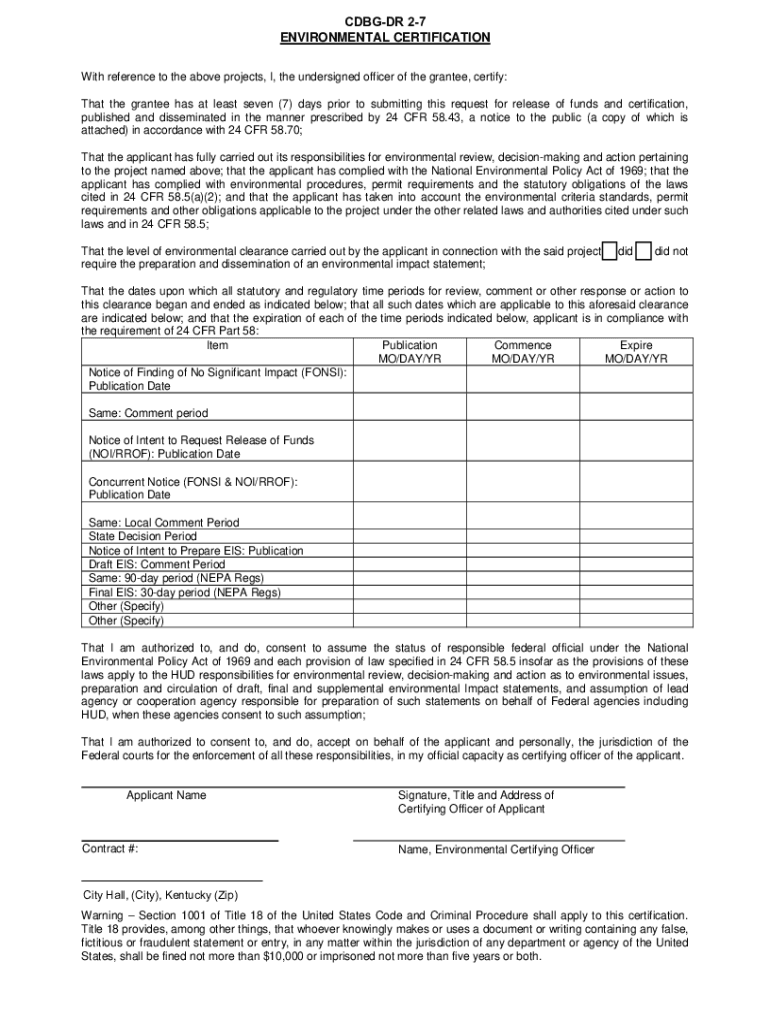 CDB GDR 27 ENVIRONMENTAL CERTIFICATION With reference to the above projects, I, the undersigned officer of the grantee, certify: That the grantee has at least seven (7) days prior to submitting this