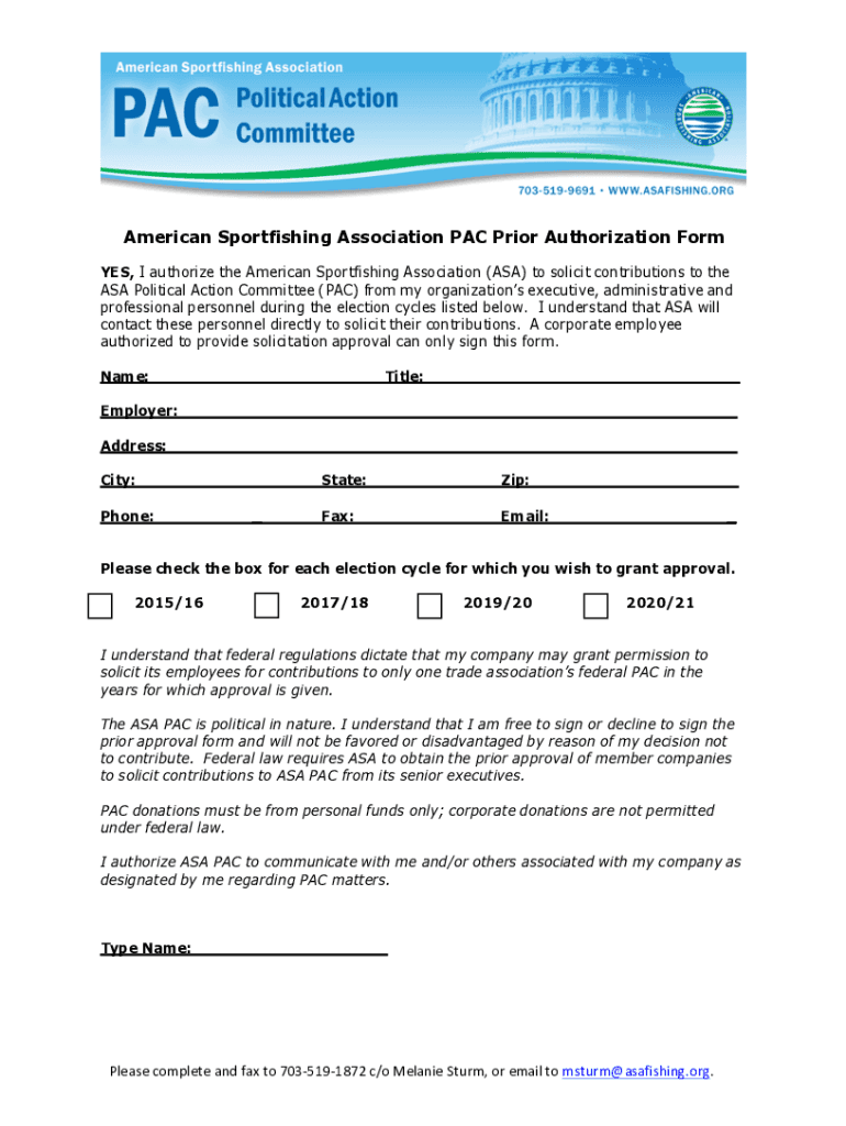 American Sport fishing Association PAC Prior Authorization Form YES, I authorize the American Sport fishing Association (ASA) to solicit contributions to the ASA Political Action Committee (PAC) from