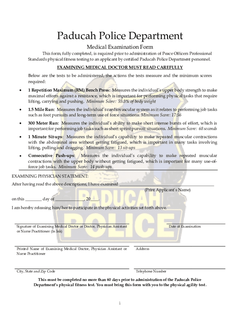 Caducei Police Department Medical Examination Form This form, fully completed, is required prior to administration of Peace Officers Professional Standards physical fitness testing to an applicant