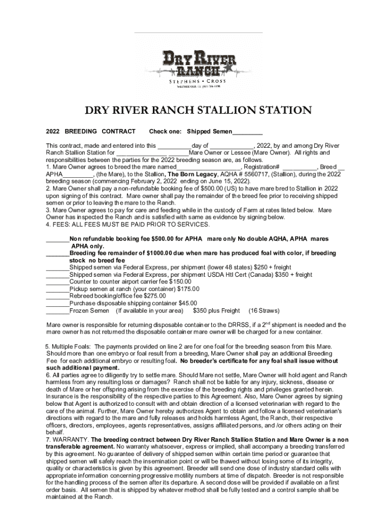 DRY RIVER RANCH STALLION STATION 2022 BREEDING CONTRACTCheck one: Shipped Semen___This contract, made and entered into this ___day of ___, 2022, by and among Dry River Ranch Stallion Station for ___