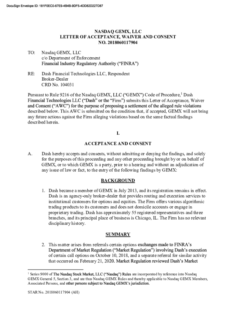 NASDAQ GEM, LLC LETTER OF ACCEPTANCE, WAIVER AND CONSENT NO. 2018060117904 TO:Nasdaq GEM, LLC c/o Department of Enforcement RE:Dash Financial Technologies LLC, Respondent BrokerDealer CRD No. 104031Pursuant