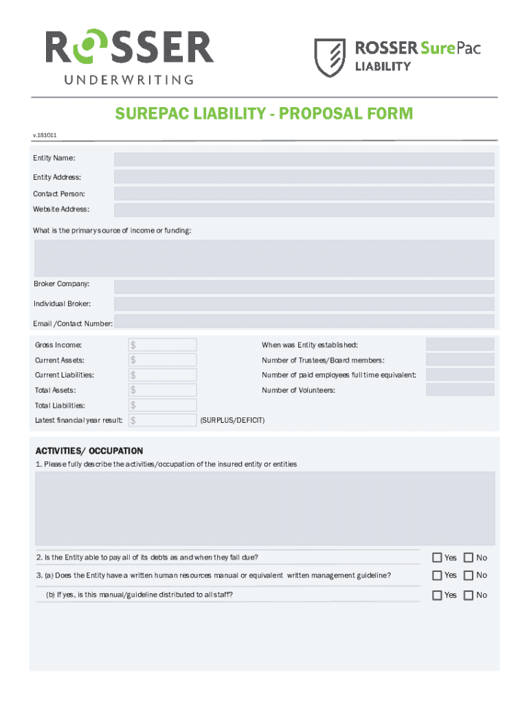 Email, fax, or share your surepac liability - proposal form via URL. You can also download, print, or export forms to your preferred cloud storage service.