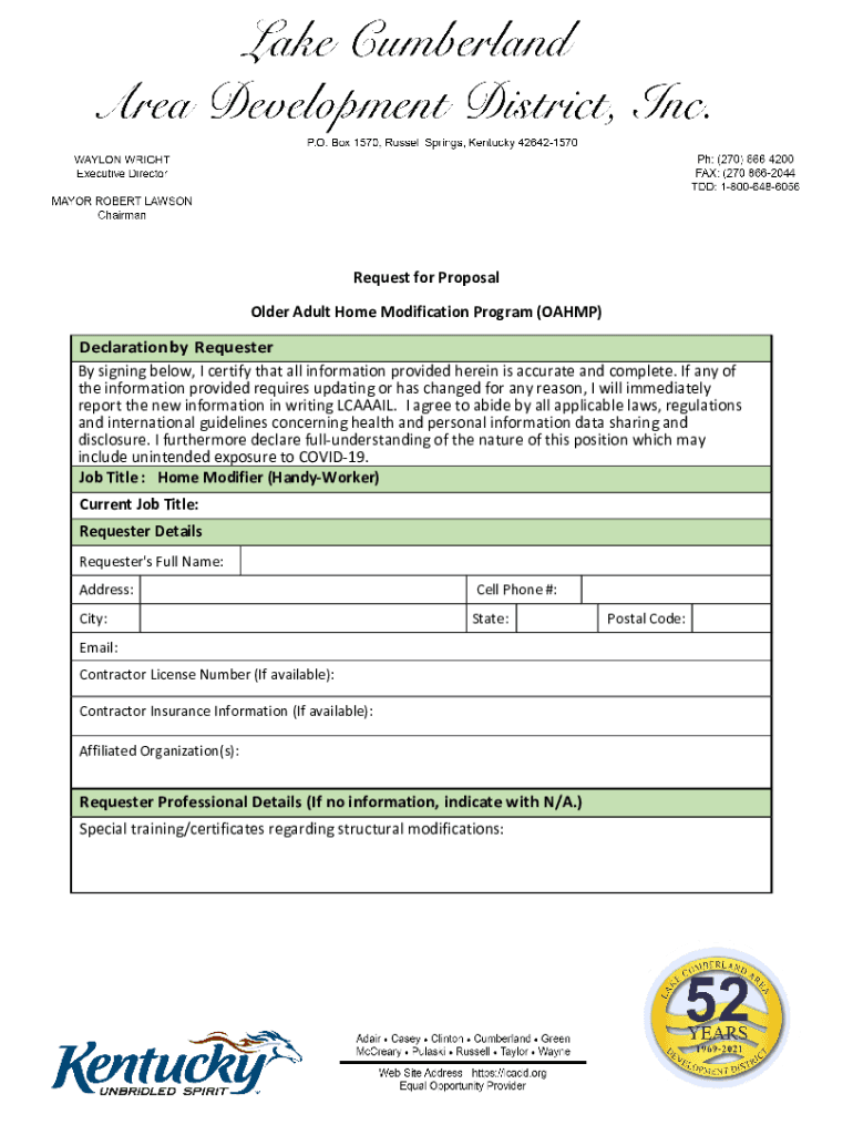 Request for Proposal Older Adult Home Modification Program (CAMP) Declaration by Requester By signing below, I certify that all information provided herein is accurate and complete. If any of the