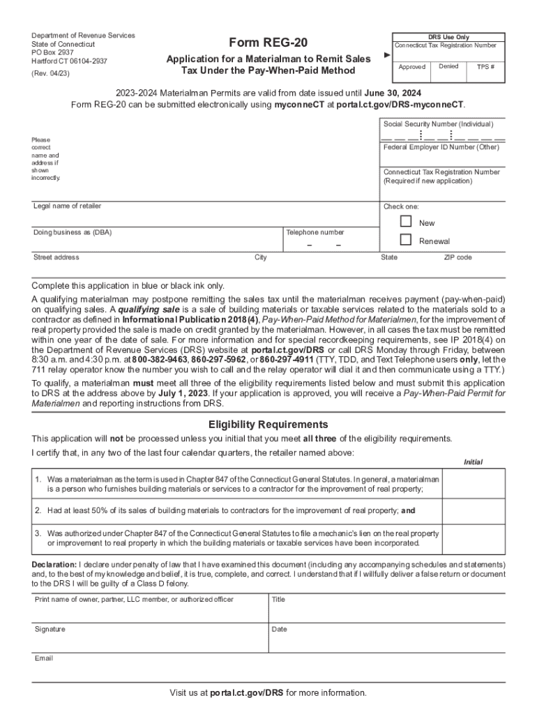 Department of Revenue Services State of Connecticut PO Box 2937 Hartford CT 061042937 (Rev. 04/23)Form REG20Application for a Material man to Remit Sales Tax Under the PayWhenPaid Method DRS Use Only