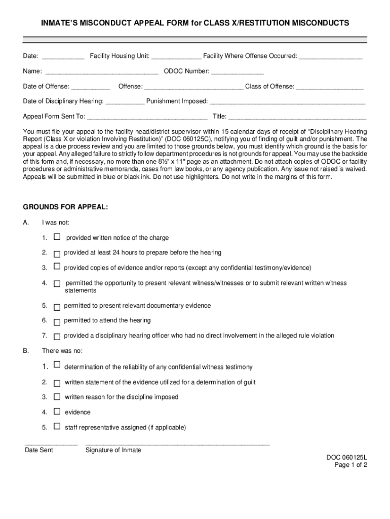 INMATES MISCONDUCT APPEAL FORM for CLASS X/RESTITUTION MISCONDUCTSDate: ___ Facility Housing Unit: ___ Facility Where Offense Occurred: ___ Name: ___ ODOR Number: ___ Date of Offense: ___Offense: