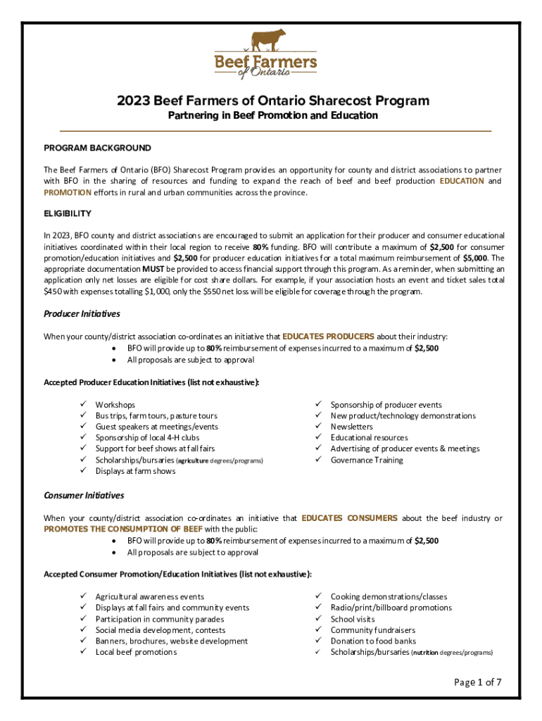 2023 Beef Farmers of Ontario Share cost Program Partnering in Beef Promotion and EducationPROGRAM BACKGROUND The Beef Farmers of Ontario (BFO) Share cost Program provides an opportunity for county