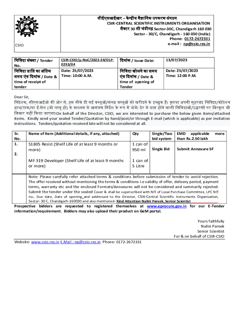 CSIRCENTRAL SCIENTIFIC INSTRUMENTS Organization 30 Sector30C, Chandigarh 160 030 Sector 30/C, Chandigarh 160 030 (India) Phone: 01722672331 e.mail : np@csio.res.inCSIO / Tender No. / Date & time of
