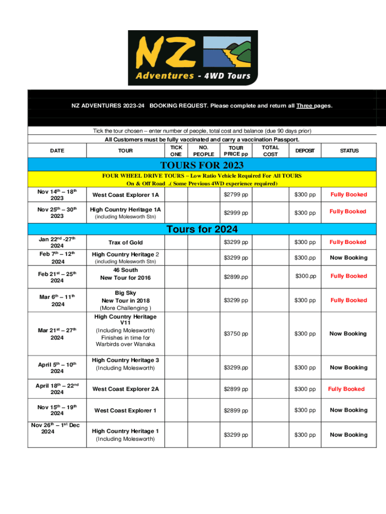 NZ ADVENTURES 202324 BOOKING REQUEST. Please complete and return all Three pages. Tick the tour chosen to enter number of people, total cost and balance (due 90 days prior)