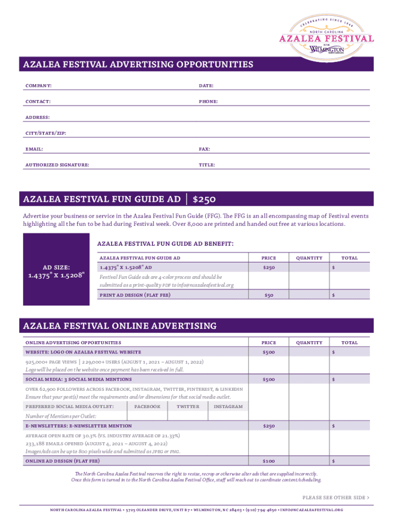 Azalea festival advertising opportunities company:date:contact:phone:address: city/state/zip: email:fax:authorized signature:title:azalea festival fun guide ad | $250 Advertise your business or service