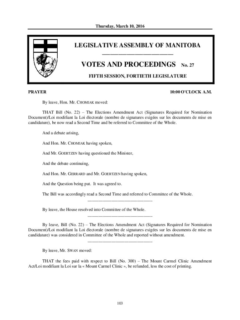 Thursday, March 10, 2016LEGISLATIVE ASSEMBLY OF MANITOBA ___VOTES AND PROCEEDINGS No. 27FIFTH SESSION, FORTIETH LEGISLATURE PRAYER10:00 O\'CLOCK A.M. By leave, Hon. Mr. COMING moved: THAT Bill (No.