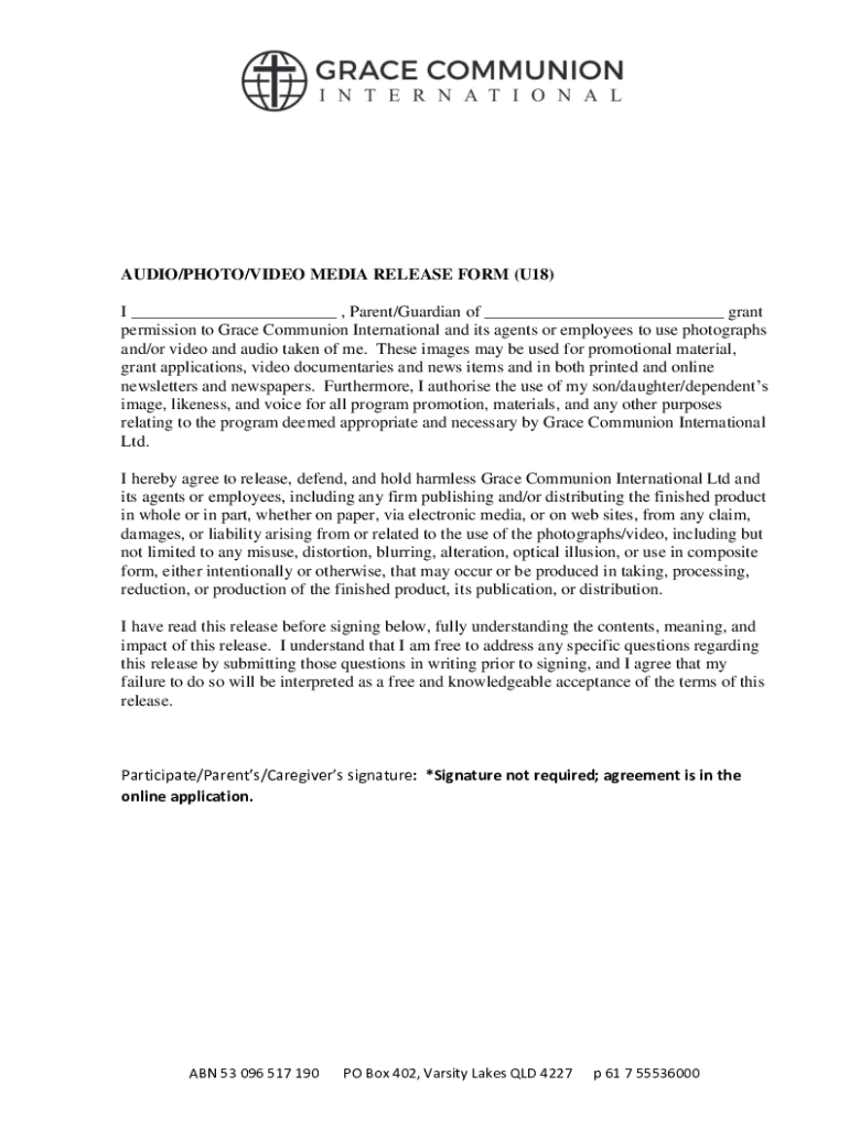 AUDIO/PHOTO/VIDEO MEDIA RELEASE FORM (U18) I ___, Parent/Guardian of ___ grant permission to Grace Communion International and its agents or employees to use photographs and/or video and audio taken