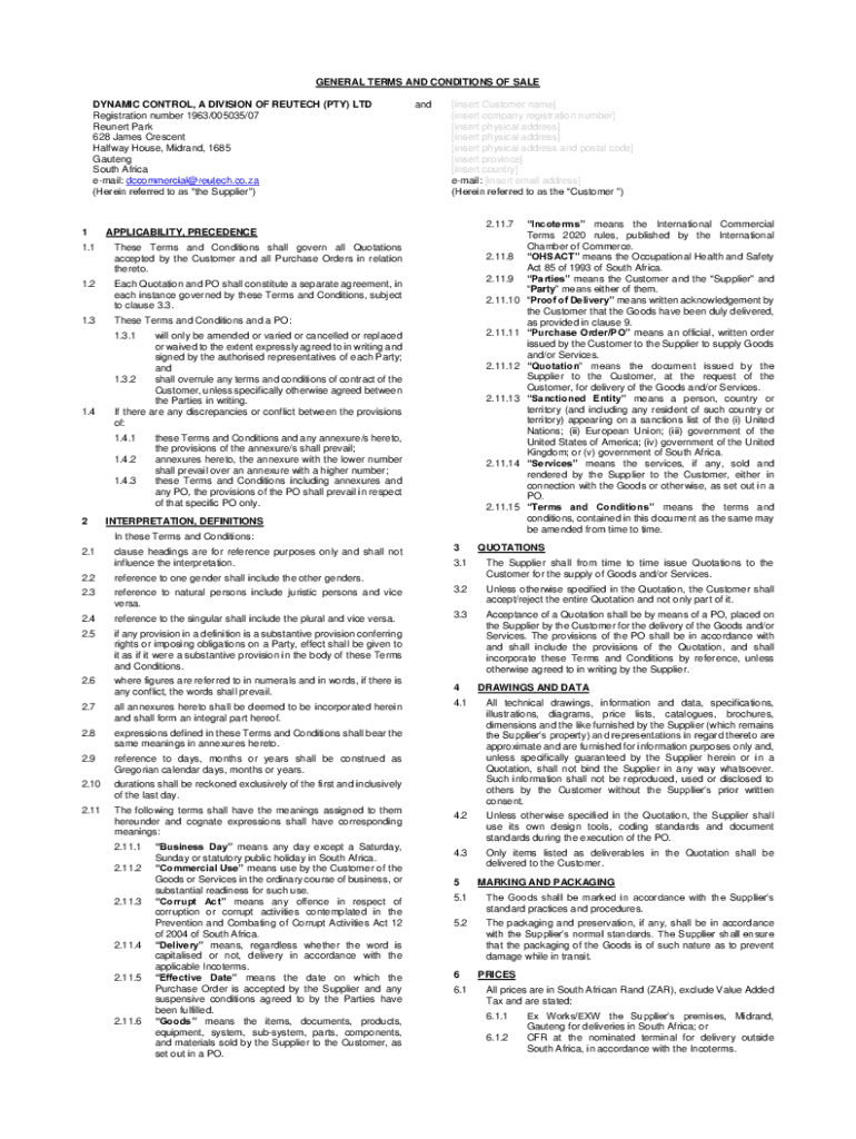 GENERAL TERMS AND CONDITIONS OF SALE DYNAMIC CONTROL, A DIVISION OF REUTERS (PTY) LTD Registration number 1963/005035/07 Rupert Park 628 James Crescent Halfway House, Midland, 1685 Gluten South Africa