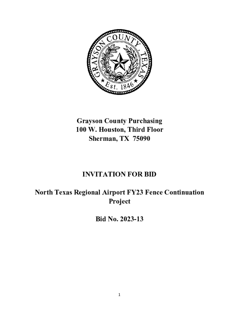 Grayson County Purchasing 100 W. Houston, Third Floor Sherman, TX 75090INVITATION FOR BID North Texas Regional Airport FY23 Fence Continuation Project Bid No. 2023131TABLE OF CONTENTS Invitation For