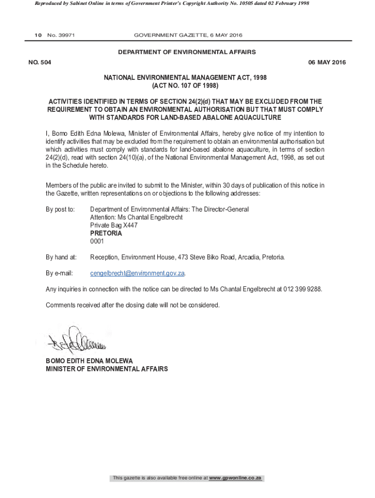 Reproduced by Cabinet Online in terms of Government Printers Copyright Authority No. 10505 dated 02 February 199810 No. 39971GOVERNMENT GAZETTE, 6 MAY 2016 DEPARTMENT OF ENVIRONMENTAL AFFAIRS NO.