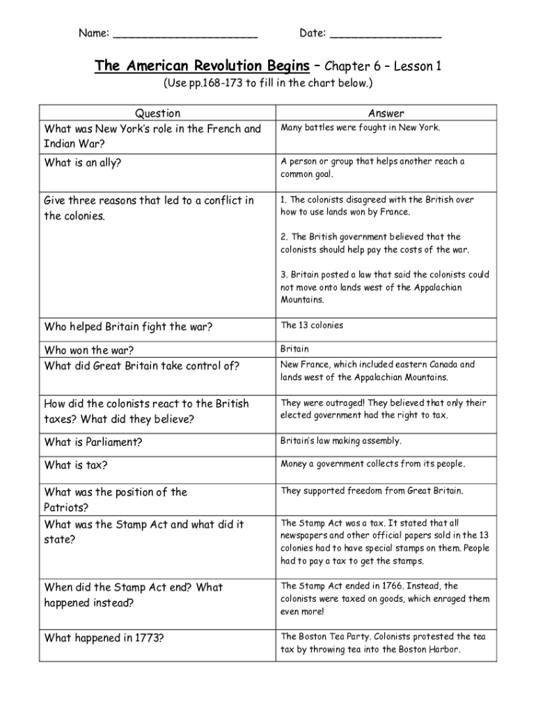 Name: ___Date: ___The American Revolution Begins Chapter 6 Lesson 1 (Use pp.168173 to fill in the chart below.) Question What was New York's role in the French and Indian War? Answer Many battles