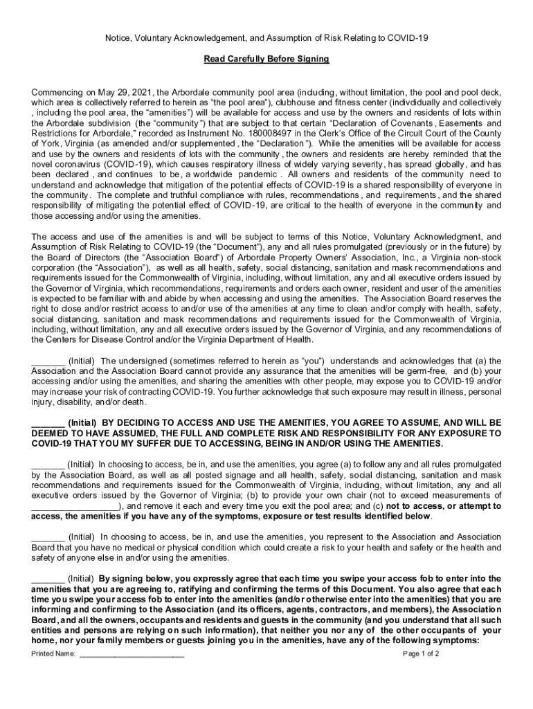Notice, Voluntary Acknowledgement, and Assumption of Risk Relating to COVID-19 Read Carefully Before SigningCommencing on May 29, 2021, the Arbor dale community pool area (including, without limitation,