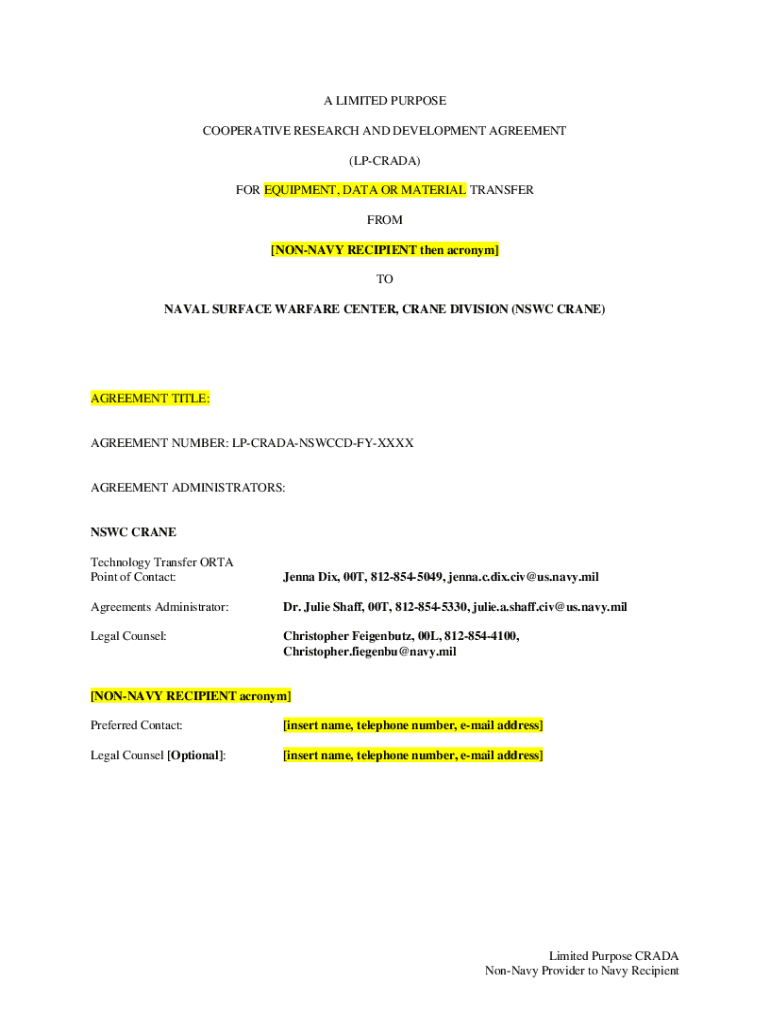 A LIMITED PURPOSE COOPERATIVE RESEARCH AND DEVELOPMENT AGREEMENT (PRADA) FOR EQUIPMENT, DATA OR MATERIAL TRANSFER FROM [NAVY RECIPIENT then acronym] TO NAVAL SURFACE WARFARE CENTER, CRANE DIVISION