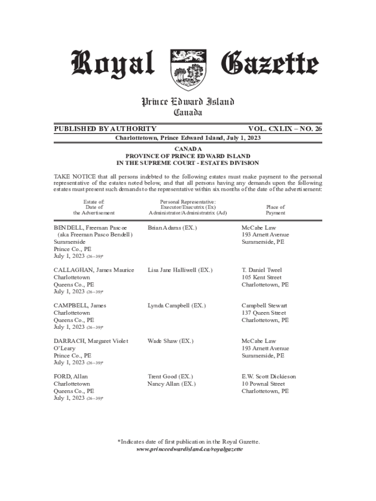 Prince Edward Island CanadaPUBLISHED BY AUTHORITY. CLIX NO. 26Charlottetown, Prince Edward Island, July 1, 2023, CANADA PROVINCE OF PRINCE EDWARD ISLAND IN THE SUPREME COURT ESTATES DIVISION TAKE