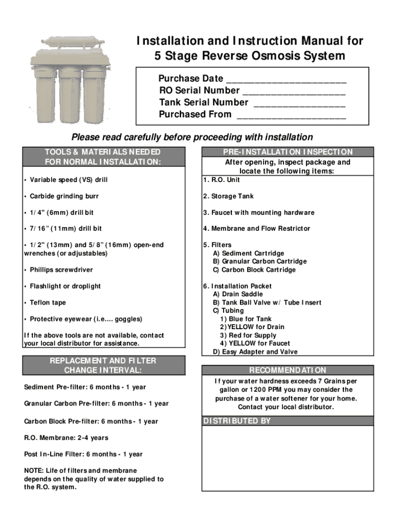 Installation and Instruction Manual for 5 Stage Reverse Osmosis System Purchase Date ___ RO Serial Number ___ Tank Serial Number ___ Purchased From ___ Please read carefully before proceeding with