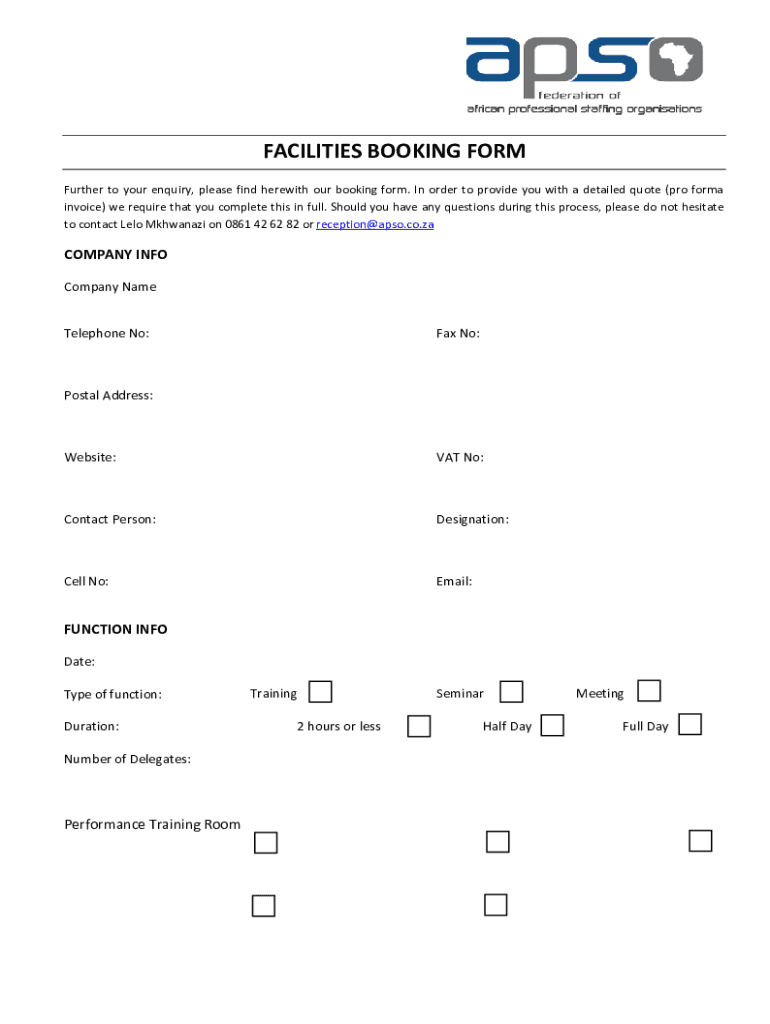 FACILITIES BOOKING FORM Further to your inquiry, please find herewith our booking form. In order to provide you with a detailed quote (pro forma invoice) we require that you complete this in full.