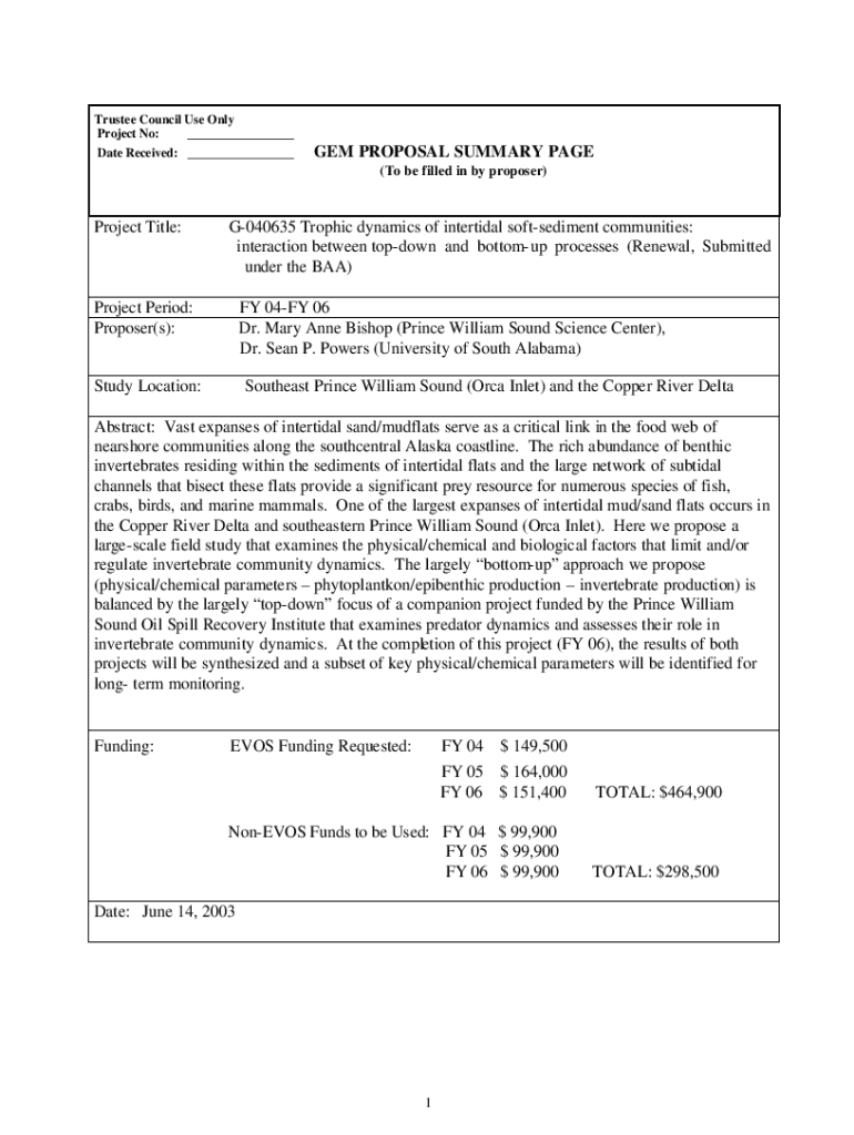 Trustee Council Use Only Project No: ___ Date Received: ___GEM PROPOSAL SUMMARY PAGE (To be filled in by proposer)Project Title:G040635 Trophic dynamics of intertidal soft sediment communities: interaction